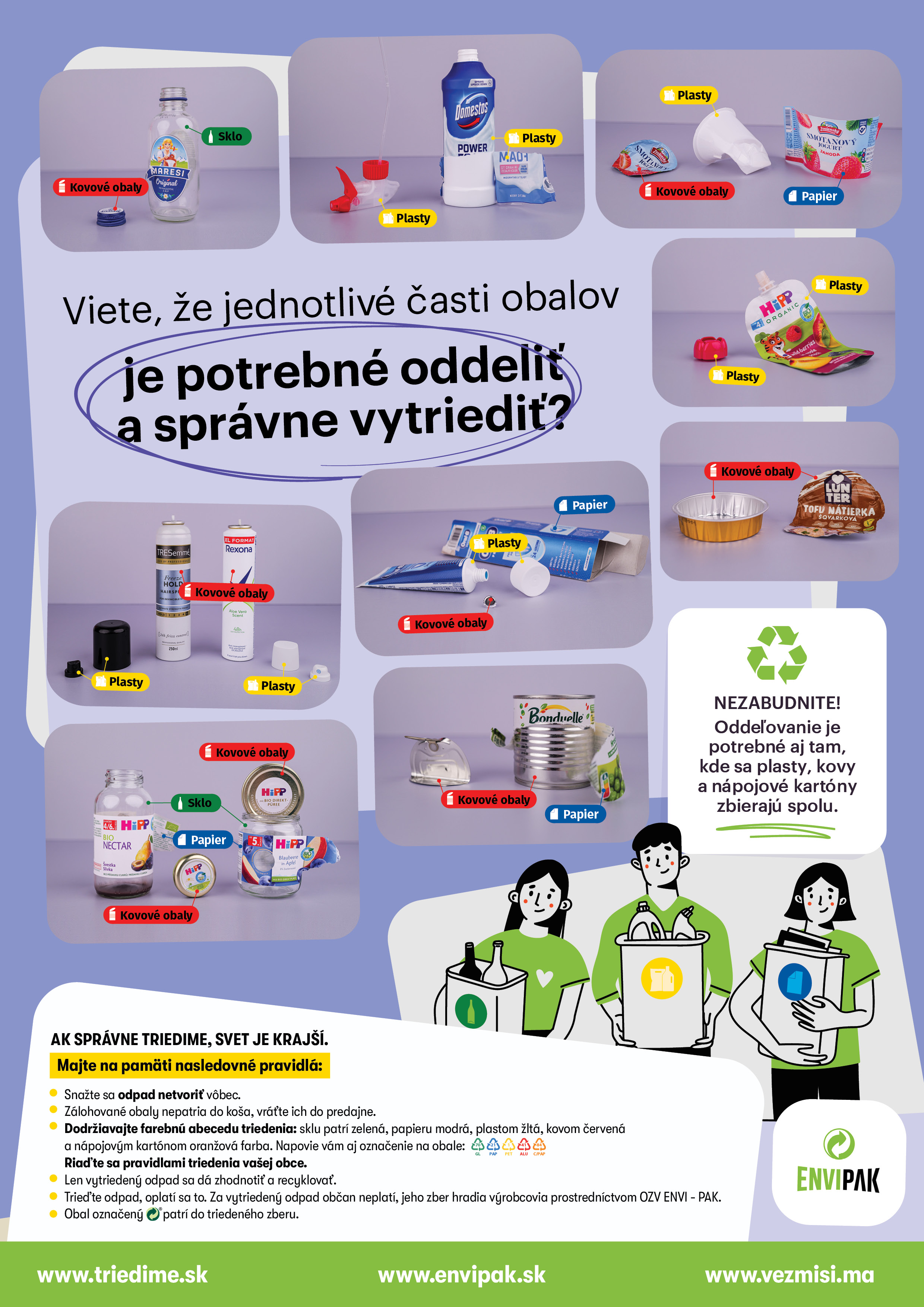 Na Slovensku dnes triedi odpad takmer každý. Prieskum OZV ENVI - PAK potvrdzuje, že triedenie deklaruje 96 % ľudí. To však ešte neznamená, že všetci triedime všetky druhy obalov, a že to vždy robíme správne. Hoci ochota triediť ľuďom už zjavne nechýba, rezervy je vidieť pri oddeľovaní jednotlivých častí obalov. Viete, prečo je dôležité oddeliť viečko od jogurtového kelímku? Alebo prečo by na ňom nemal ostať papierový rukáv?